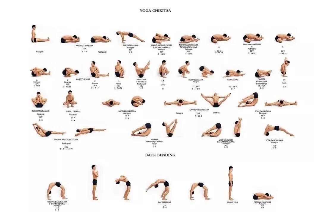 阿斯汤加瑜伽共有6个序列,一系列Yoga chikitsa练习对身体起到理疗和修复的功效。一级序列包括4个部分:拜日式、站立体式、坐立体式、结束体式。