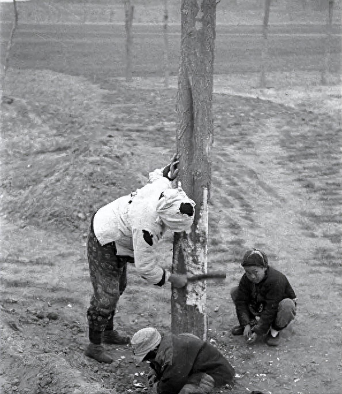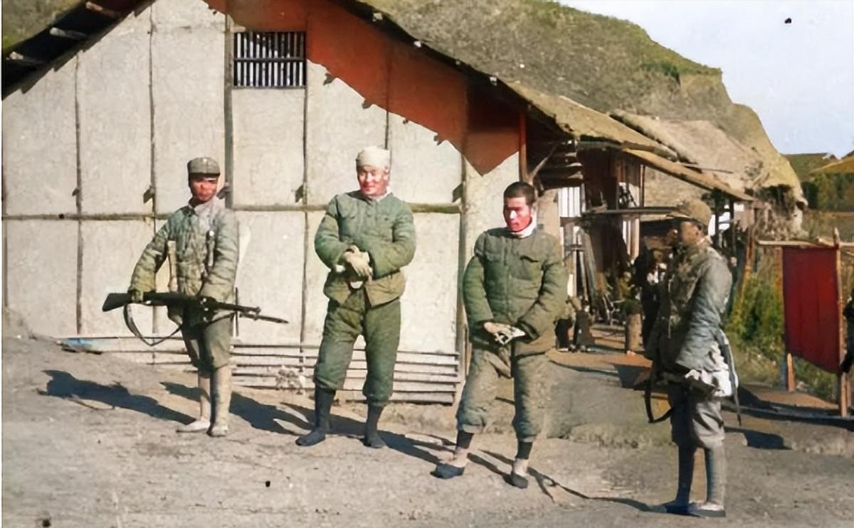 图站中间的两位是被我军俘虏的日寇。照片中这几名沾满了中国军民鲜血的日寇看起来相当的放松悠闲,可见在战俘营中生活的还是比较舒服的。