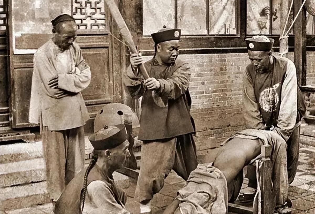 下图是官府的衙役正在对犯人打板,二十大板下去,轻的当场走不了路,重的责屁股开花!不过这种刑罚,在古代还是算比较轻的!