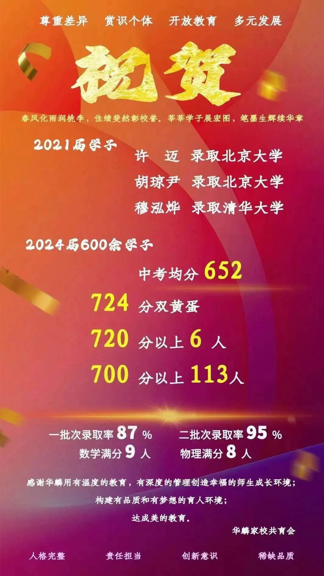2024年中考参考人数316人,年级均分612.2分,最高分714分,700分以上10人,600分以上216人,538-600分55人。