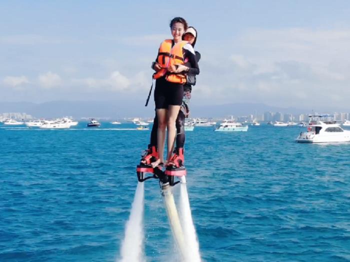 几人在游艇上欣赏完风景后就开始玩些水上运动,徐梦迪胆子大,体验了一把水上飞行。她被男教练抱在怀里,一双长腿又白又直,美到让人移不开眼。她与教练的手紧紧挨在一起,互动姿势非常亲密。