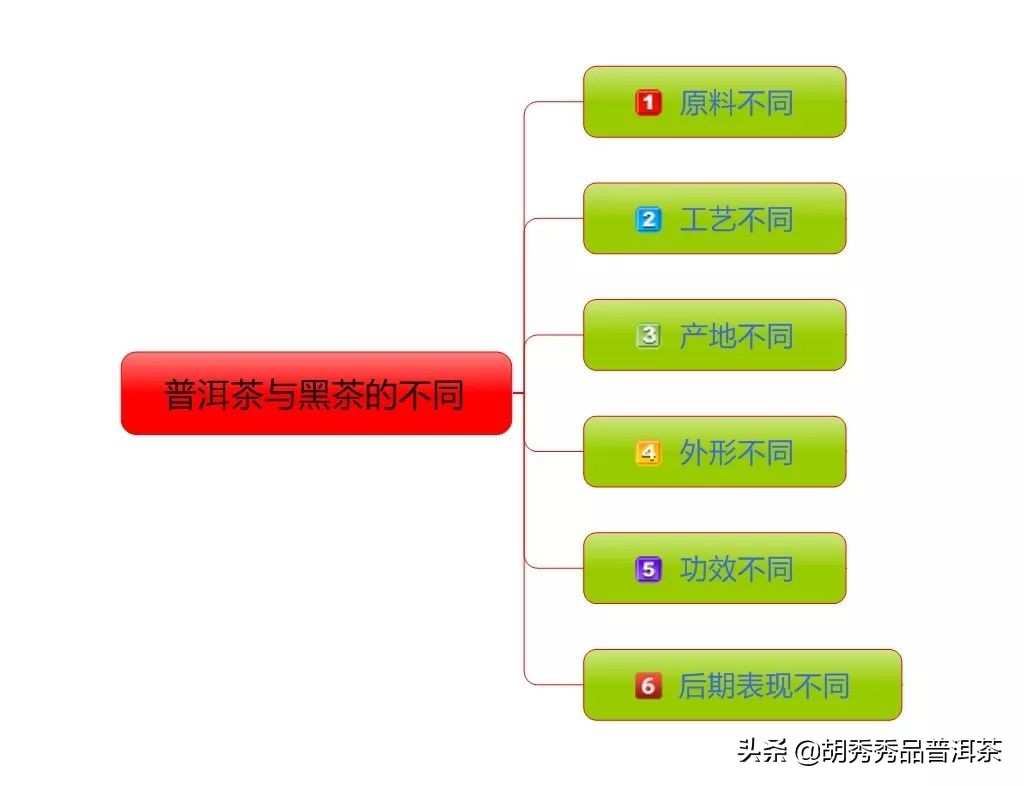 云南普洱茶的原料是云南大叶种鲜叶,黑茶的原料是中小叶种的鲜叶;此外普洱茶选用的是较细嫩的鲜叶,黑茶的则相对粗老。
