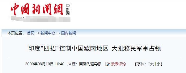 中国新闻网:《印度"四招"控制中国藏南地区 大批移民军事占领》2009年8月10日