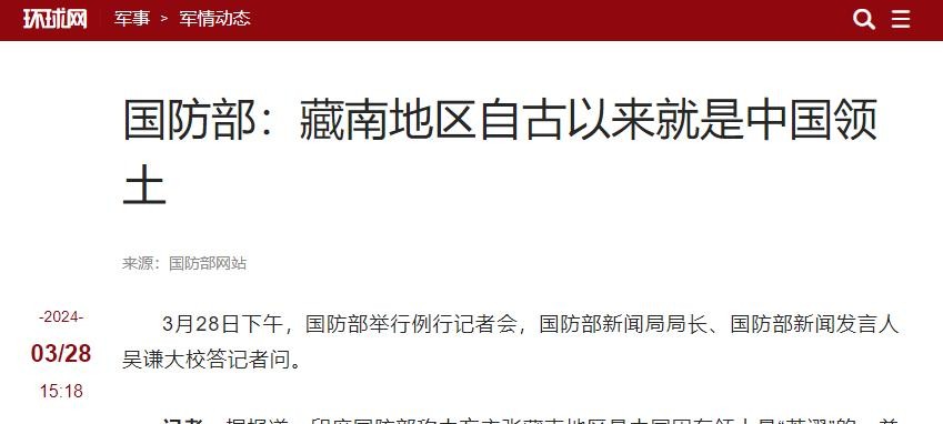 环球网:《国防部:藏南地区自古以来就是中国领土》2024年3月28日