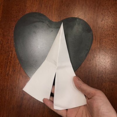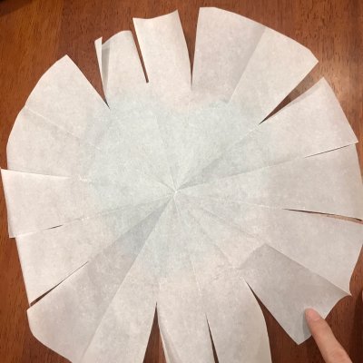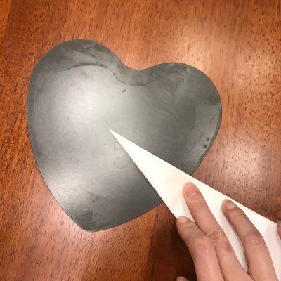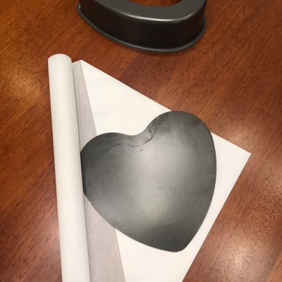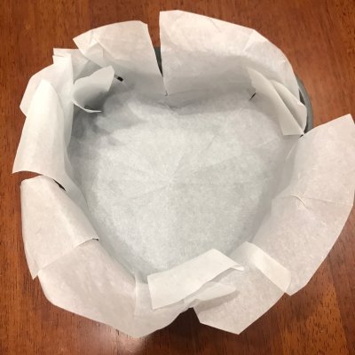 9、用油纸铺在膜具底部,我用的是心形的膜具,比圆形的略难铺一点点,折一张正方形的纸