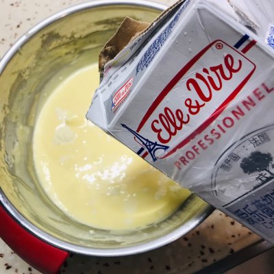8、搅拌均匀,直接倒入200g淡奶油,拌匀