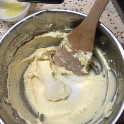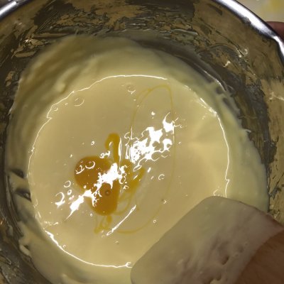 6、再分4次加入蛋液,三个全蛋和一个蛋黄,蛋黄多是为了上色