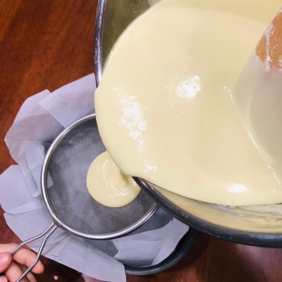 14、将芝士蛋糕液过筛倒进膜具里,也是为了口感更细腻,因为是纯手打的,还是有很多大颗粒的