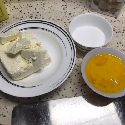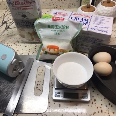 1、一直偏好铁塔的淡奶油和黄油类产品,奶油奶酪360g、白砂糖80g、全蛋三个、蛋黄一个、淀粉10g、淡奶油200g