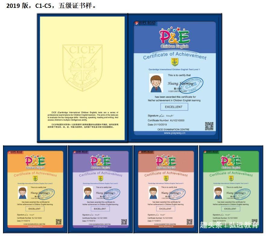 考试合格者均可获得由“全国剑桥CICE考试中心”统一签发的等级证书,证书以英文书写,终生有效。为保证该证书的权威性和真实性,剑桥CICE中心专门提供查询网站设立成绩查询系统(www.playway.cn),供考生和家长进行查询确认。
