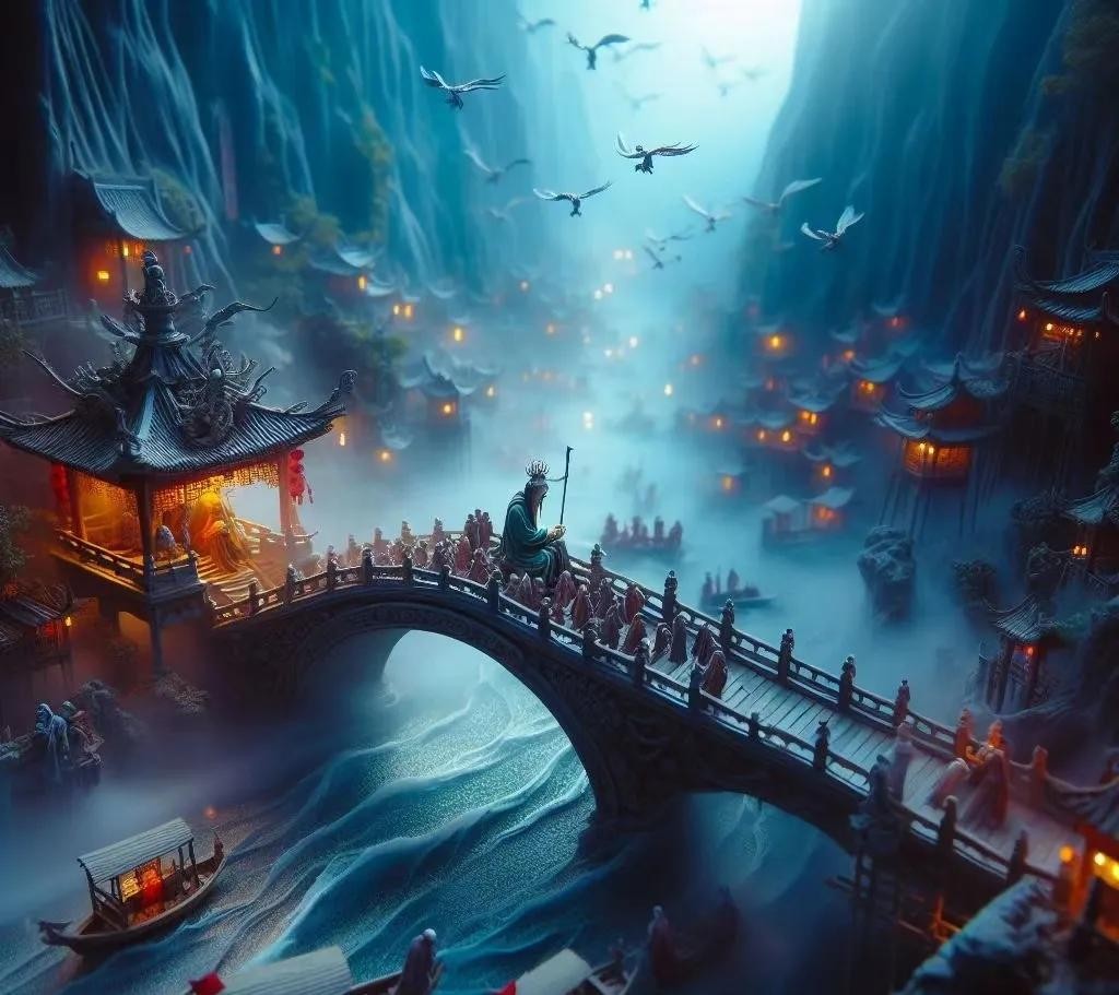 5. **孟婆**:在地府的奈何桥上,孟婆负责给过桥的亡魂递上一碗孟婆汤,以忘却前世的记忆,准备进入轮回。孟婆及其助手(有时会有小童协助)虽然人数不多,但在轮回机制中扮演着关键角色。
