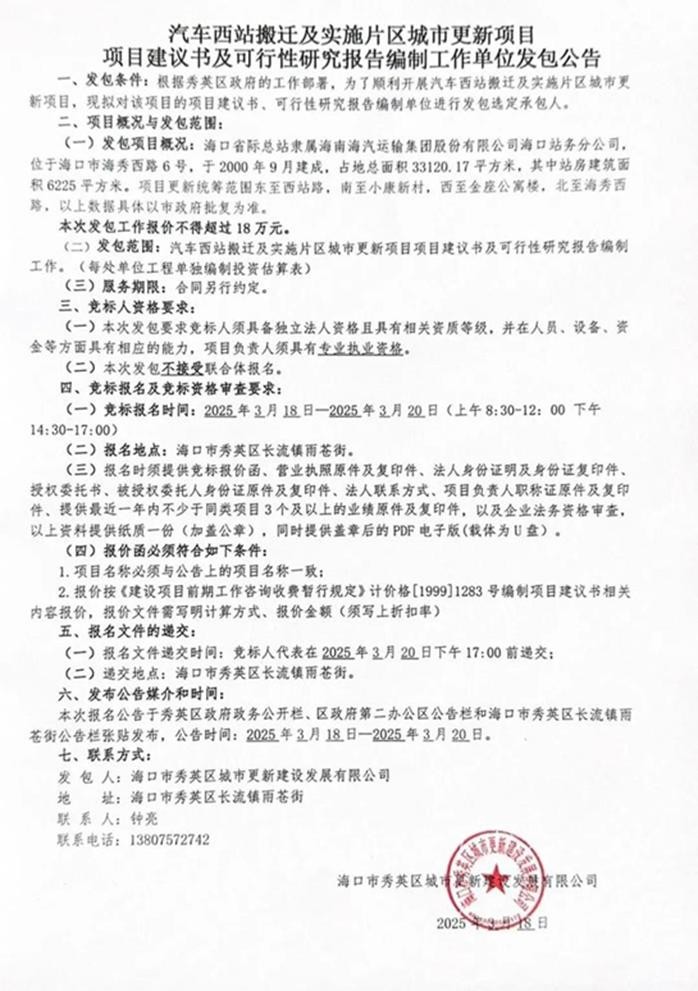 现将秀英区政府官网上《汽车西站搬迁及实施片区城市更新项目项目建议书及可行性研究报告编制工作单位发包公告》的截图呈上: