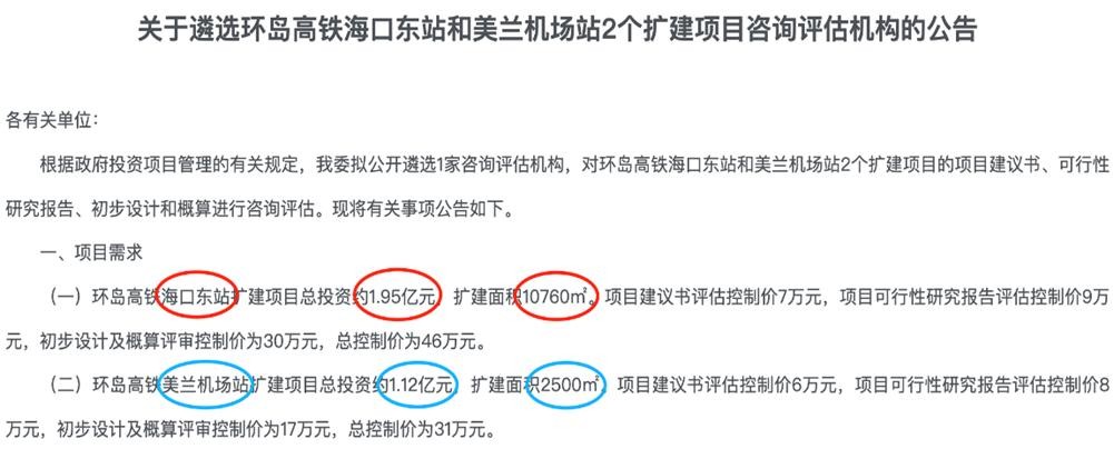 和汽车站的落寞截然不同,高铁这边可是发展得热火朝天。例如在省发改委网站上就能看到两个高铁站扩建项目的公告,高铁海口东站投资约 1.95 亿元,扩建完新增面积达 10760㎡,美兰机场站扩建项目投资约 1.12 亿元,扩建面积 2500㎡。