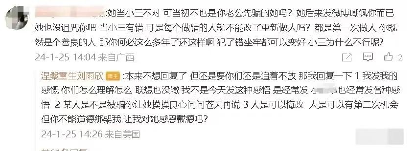 刘雨欣的回应得到越来越多网友的支持。有网友表示理解她的坚持,认为她对待小三的态度是正当的。舆论逐渐倾向于支持刘雨欣。