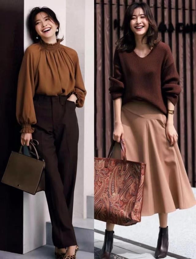 巧克力色跟巧克力色搭配就是最为简单,最高级的搭配,这种同色系搭配是高级感的首选。只要提到高级感穿搭,那就用上它,绝对不会出错。
