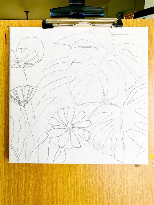 1、 首先用铅笔将要画的图案在油画板上轻轻的勾画出基本的轮廓,不需要画的太深,这样也会影响后面上色阶段的效果。