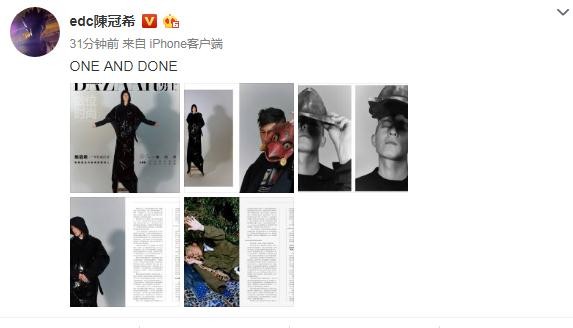 4日中午,陈冠希发微博,晒出自己在芭莎男士的时尚图,该杂志对陈冠希还进行了专访。