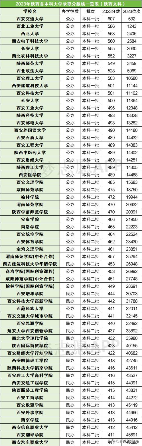 以陕西2023年的招生数据为例,在理科方面,各本科大学的录取线在344-628分之间,位次在2770-127977之间;在文科方面,各本科大学的录取线在411-607分之间,位次在632-45683之间。