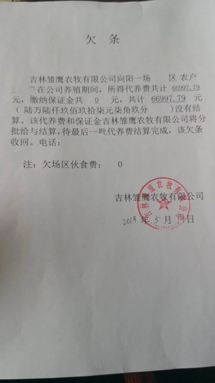 养殖农户提供的吉林雏鹰出具的借条