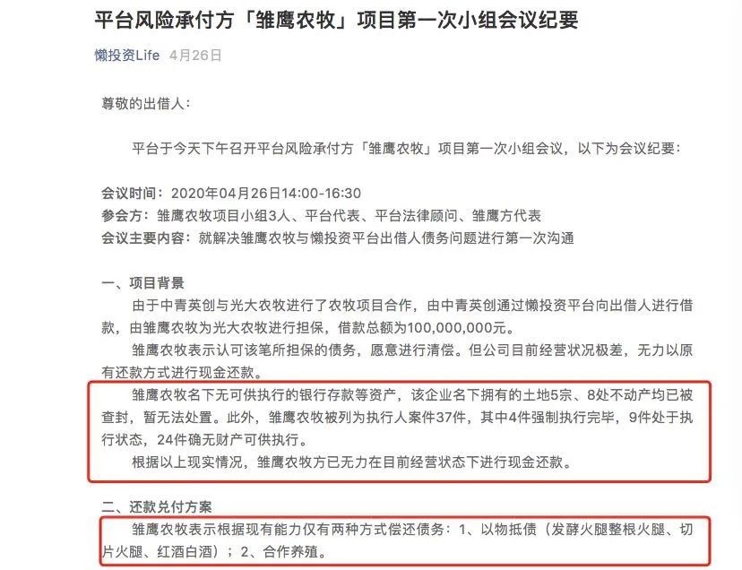截至当前,雏鹰农牧的具体负债数据尚不得而知,但记者注意到,4月26日,懒投资Life在其公众号上发布的一篇文章中提及,雏鹰农牧认可其为光大农牧进行1亿元借款的担保,并愿意进行清偿。
