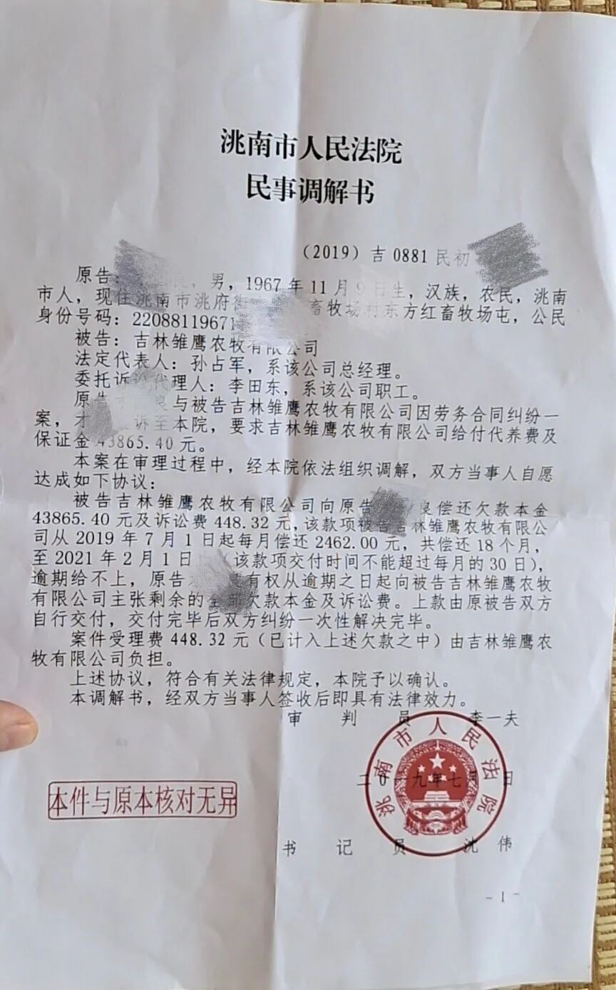 向法院起诉,是李薇所言的“某些途径”之一。8月上旬,记者从4名吉林雏鹰养殖农户获得了其各自名下的洮南市人民法院民事调解书,共计14份,涉及金额达70.79万元。这些民事调解书均显示,2019年7月,经该法院调解,原告养殖农户与被告吉林雏鹰达成共识,后者承诺全部欠款本金自从2019年7月1日起,至2021年2月1日止,分期偿还相关债务。