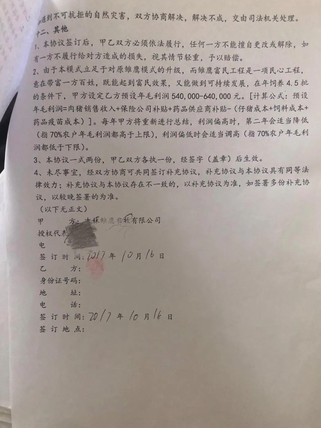 “由于本模式立足于对原雏鹰模式的升级,而雏鹰富民工程是一项民心工程,意在带富一方百姓,既能起到富民效果,又能做到可持续发展,在年饲养4.5批的条件下,甲方设定乙方年毛利润540000-640000元。”《国际金融报》记者在一份甲方为吉林雏鹰与乙方为农户签订的《肉猪舍饲养合作协议(3.0)》的文件中看到,雏鹰方面曾这样写道。