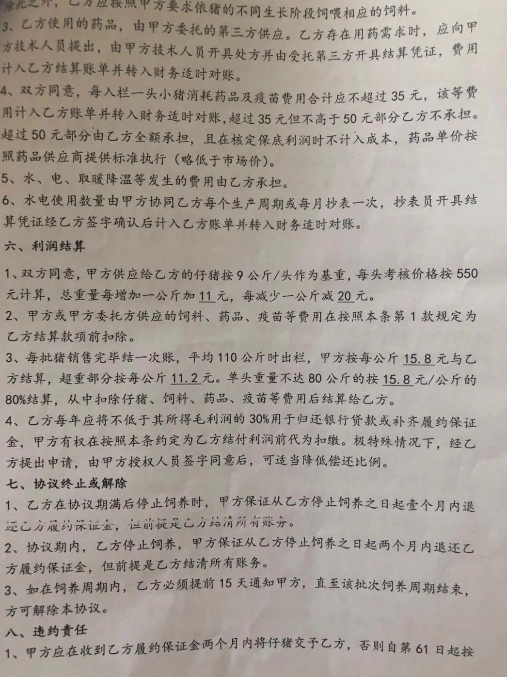 像许可这样一人承包多栋猪舍的农户不在少数。根据多名吉林雏鹰养殖农户提供的数据,自2017年下半年起,吉林雏鹰至少与300多家农户签订合作协议。根据协议,吉林雏鹰与农户约定,前者分批向后者提供2000头肉仔猪,仔猪按9公斤/头作为基重,平均按110公斤出栏,之后再依据猪的重量等因素,向养殖户支付代养费。
