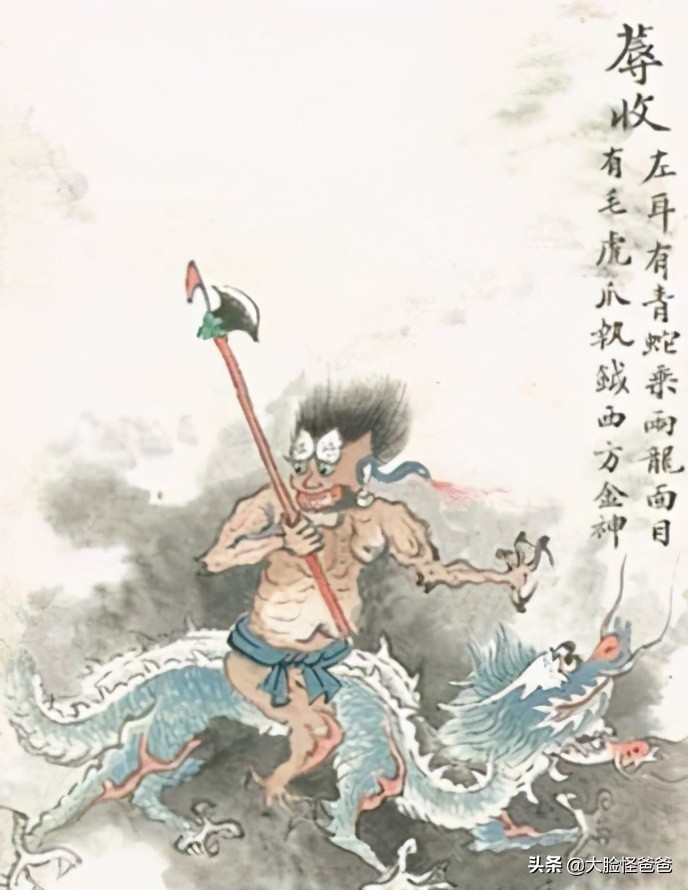 蓐收,是上古神话传说中的金神、秋神、刑神以及西方之神,他同时也是西方帝少昊的儿子与辅佐神。传说中的蓐收长着人面、白毛、虎爪,手执一把锋利的钺,左耳上环有一条蛇,身乘两龙。