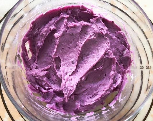第二步:蒸熟的紫薯和芋头放到一个大碗里,用勺子压成泥,加入炼乳和纯牛奶搅拌均成细腻的泥。