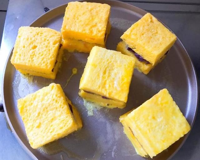 小贴士:我这里做的是紫薯馅的西多士,大家可以换成任何自己喜欢的馅料,夹什么都可以哦;裹蛋液的过程要快,裹好后要立刻捞起,否则吐司会泡软。