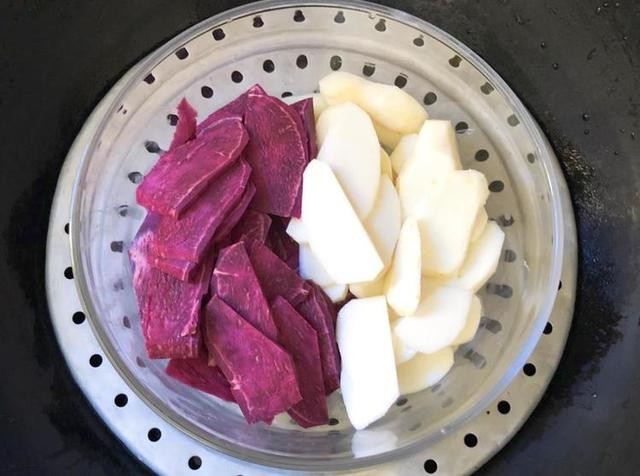 第一步:紫薯和芋头分别去皮清洗干净,然后切成薄片,开水上锅蒸熟,蒸到能用筷子轻松扎透的程度就可以出锅了。