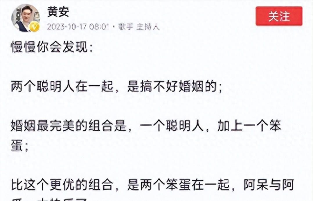 细心的网友可以发现照片中存在抠图痕迹且模糊不清,这都是黄安p图技术不佳所致。然而,这条动态的重点并非在于照片,而是黄安对于“婚姻最完美的组合”的深刻理解。