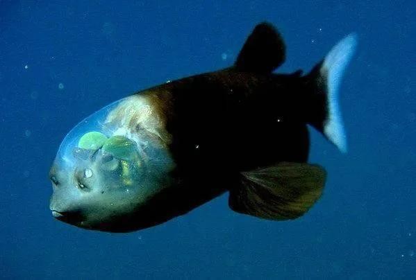 脑部呈透明状,更神奇的是,我们以为的“眼睛”,其实并不是桶眼鱼的眼睛,而是它的鼻孔,它头顶上两片像叶子一样形状的,才是它真正的眼睛。