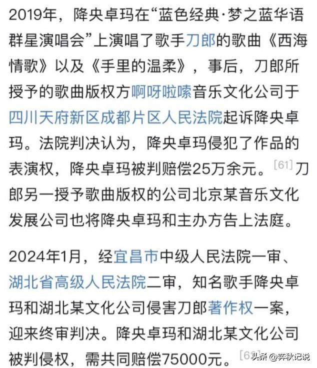 最终的结局,也是以降央卓玛败诉并且赔偿刀郎数万元作为收场。