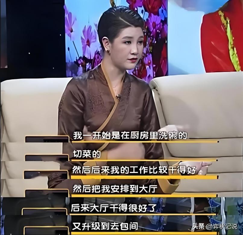 因为家庭贫困的原因,她上到初中就辍学出去打工,从酒店的洗碗工做起,一路做到了服务员的位置。