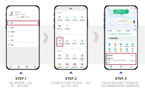 求职者使用手机进入微信“服务”,点击“出行服务”,定位到“北京”,或在微信直接搜索“附近的工作”,就能查看到按照距离远近排序,并在地图上精准定位的灵活用工岗位信息。求职者可直接查看岗位详情、薪酬水平、岗位内容,看到心仪岗位即可进行简历投递、应聘报名、在线交流、结果确认一体化线上操作。