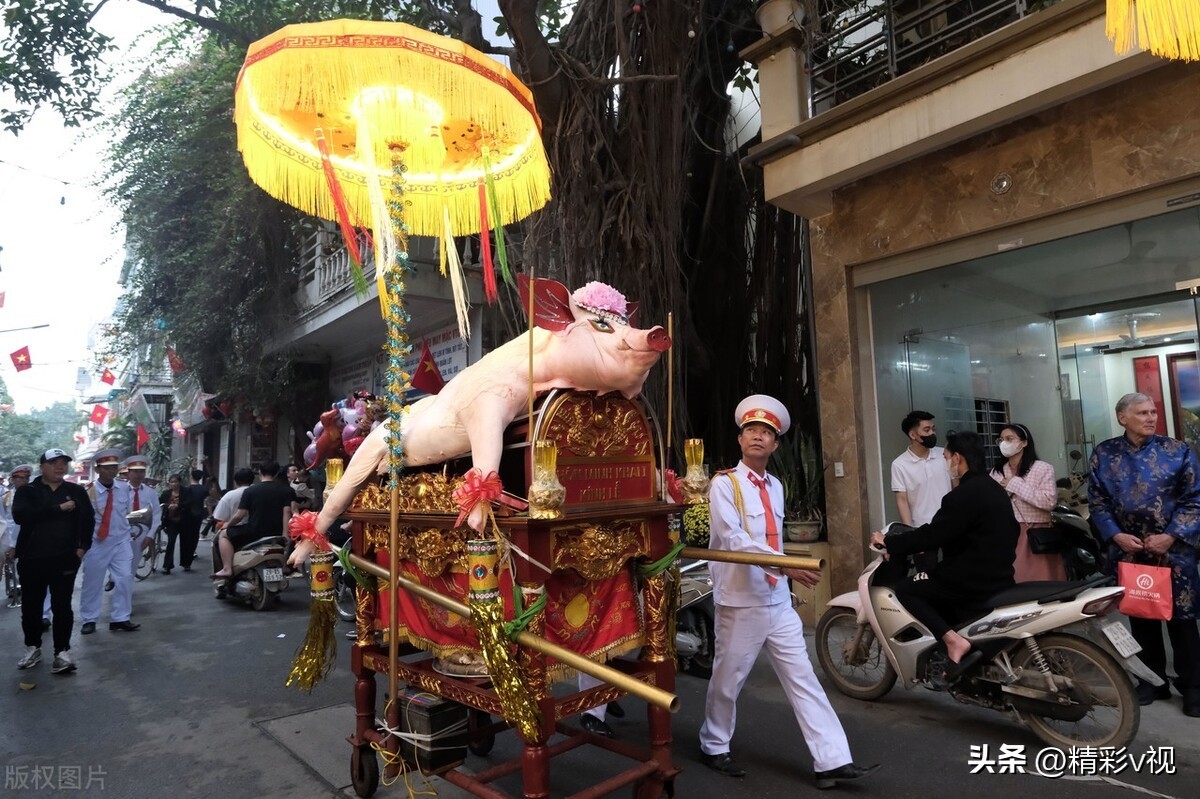 在越南,春节有个传统,将最肥最美的猪打扮起来,先送到祖庙里给老祖宗享用香火,然后村民们争先恐后、分而食之。