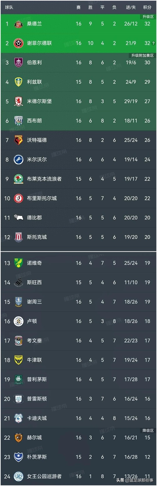 英冠积分榜:桑德兰1:1遭4连平,谢菲尔德联2:2第2,米堡6:2取3连胜