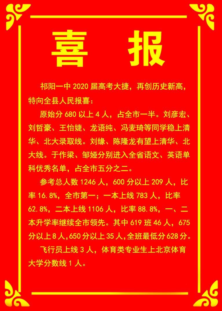 2018年:祁阳一中一、二本上线突破1100人大关。其中一本上线突破670人,比2017年增加200人。