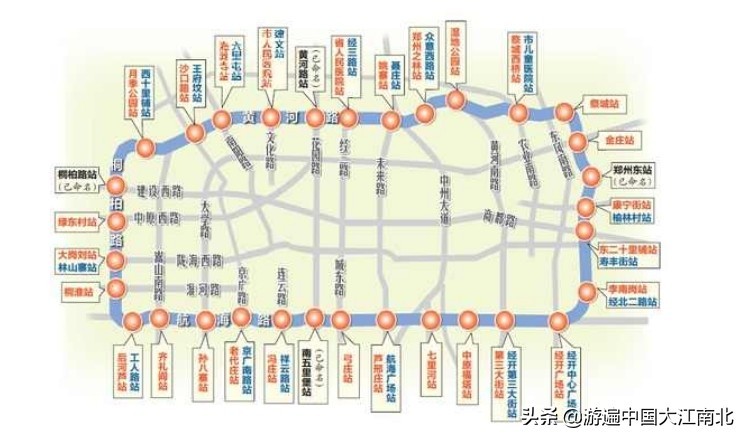 郑州地铁5号线西起月季公园站,沿郑州中心城区的西站路向东折向黄河路向东延伸,至中州大道进入商务外环路,向东经龙湖外环南路、平安大道、东风南路,折向心怡路向南,至经北二路向西沿航海东路、航海中路,向北折向桐柏南路,沿桐柏北路、西站路,终点回到月季公园站。[22]