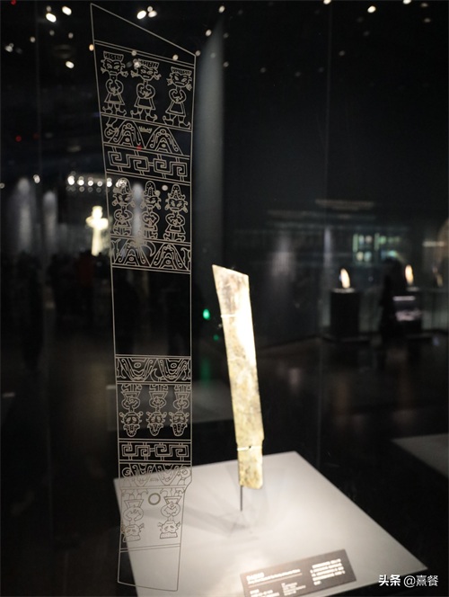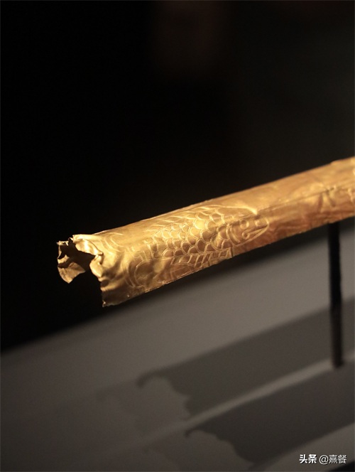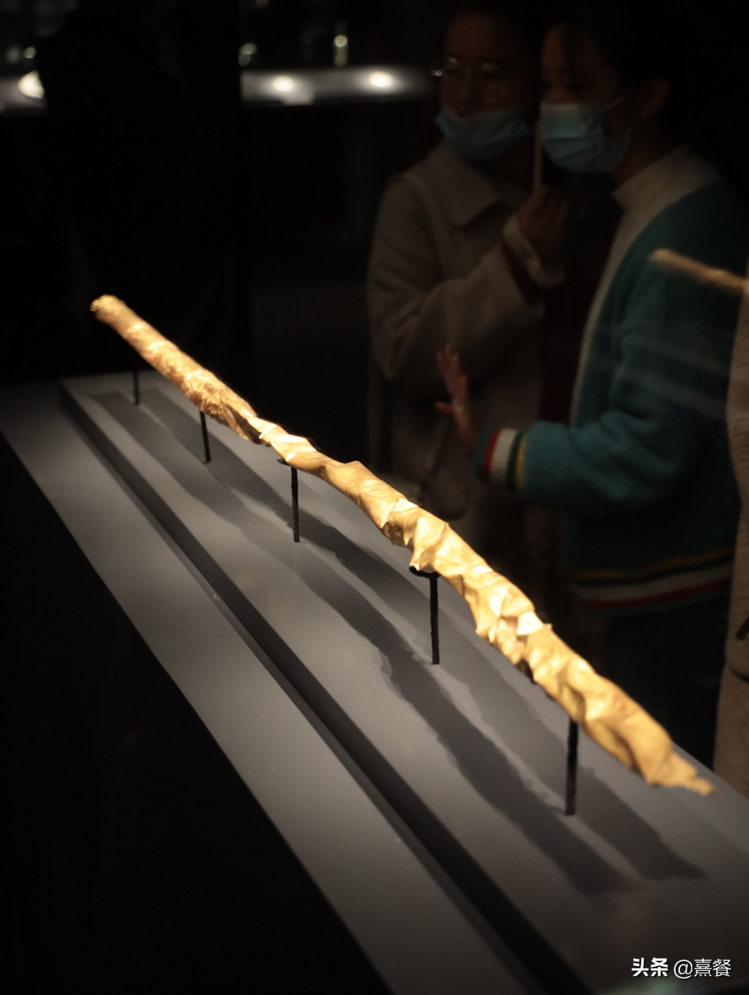 ·金权杖,就在大立人旁边,权杖的里面是木质的,外面包裹一层金皮,木头已经腐朽,现在只剩下外皮金箔