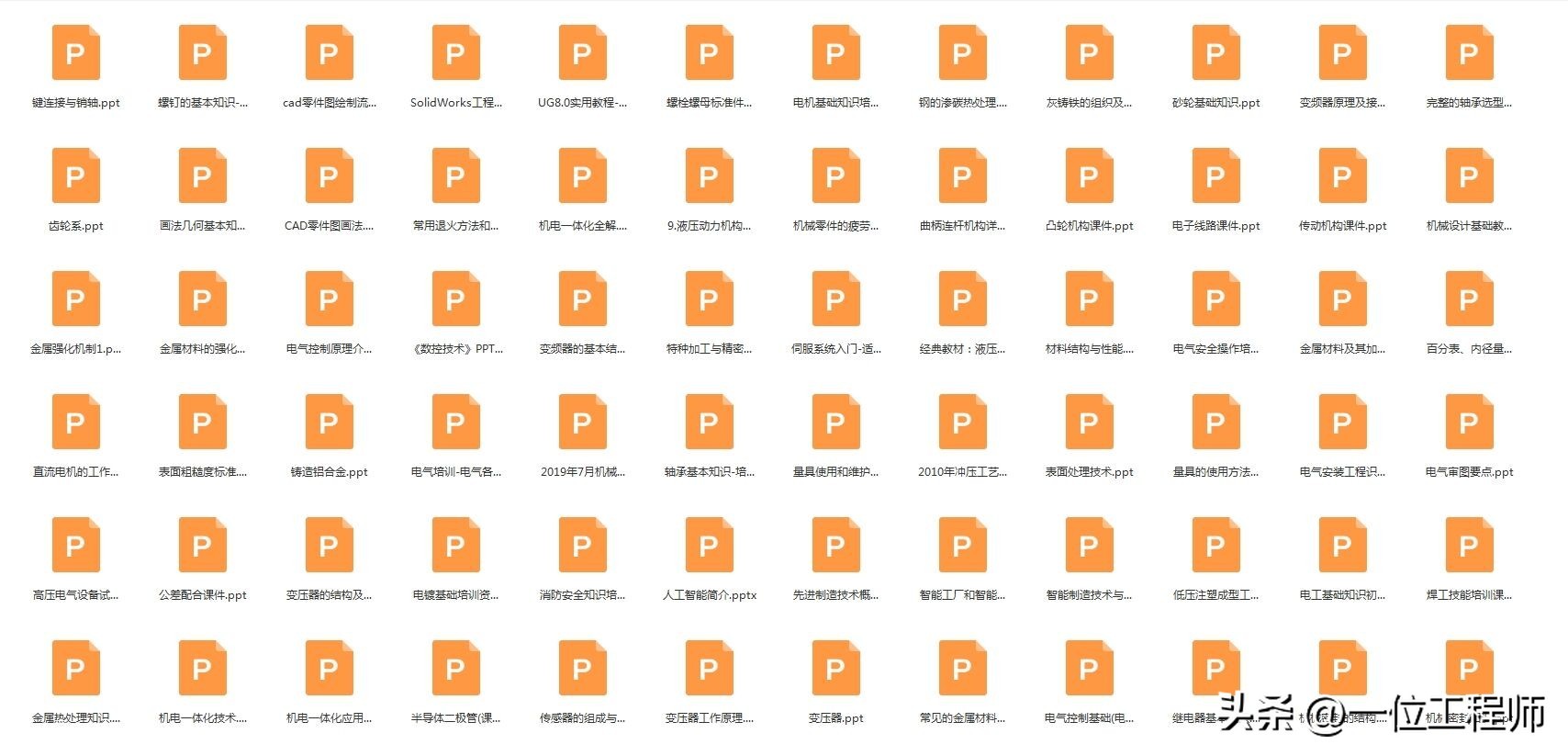 具体内容有:文档手册类(千余份工程师设计手册、机械设计手册、机电相关手册、液压类手册、自动化类手册、材料成型手册、非标设计手册等等,所有历史文章的PPT源文件等)。