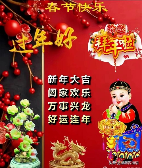 龙年春节祝愿你:喜气洋洋,满面阳光灿烂;兴高采烈,心情舒畅灿烂;大步流星,金光大道闪耀;千家万户,笑语盈盈灿烂;祝福提携,暖心相伴灿烂。祝你春节快乐,龙年大吉!