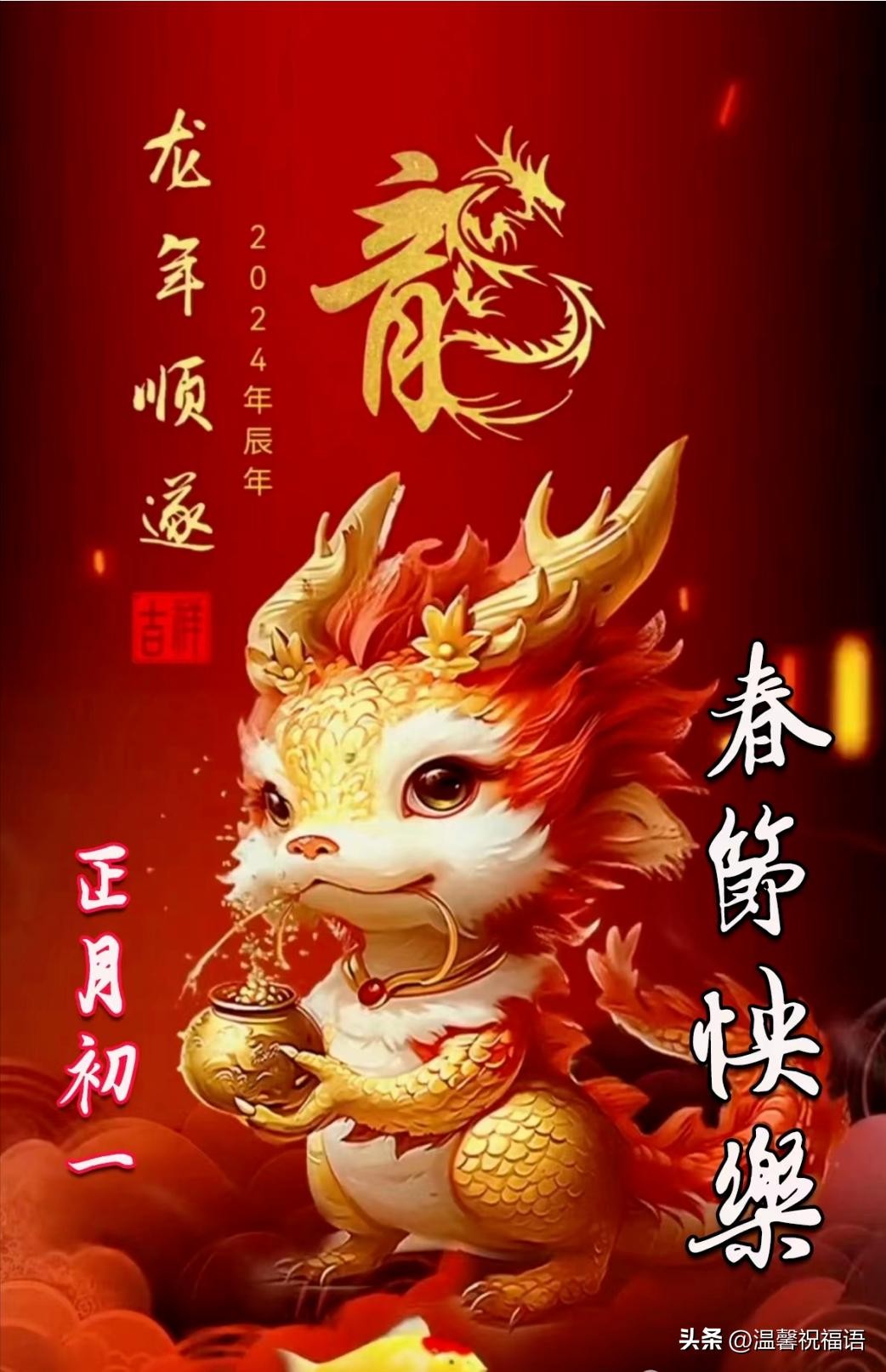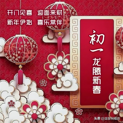 龙年快乐迎新春,大年初一福满身。喜庆欢腾笑声起,好运连连缠绵绵。财神驾到送财富,健康平安常相伴。龙年大年初一喜满堂,福禄吉祥万家欢!