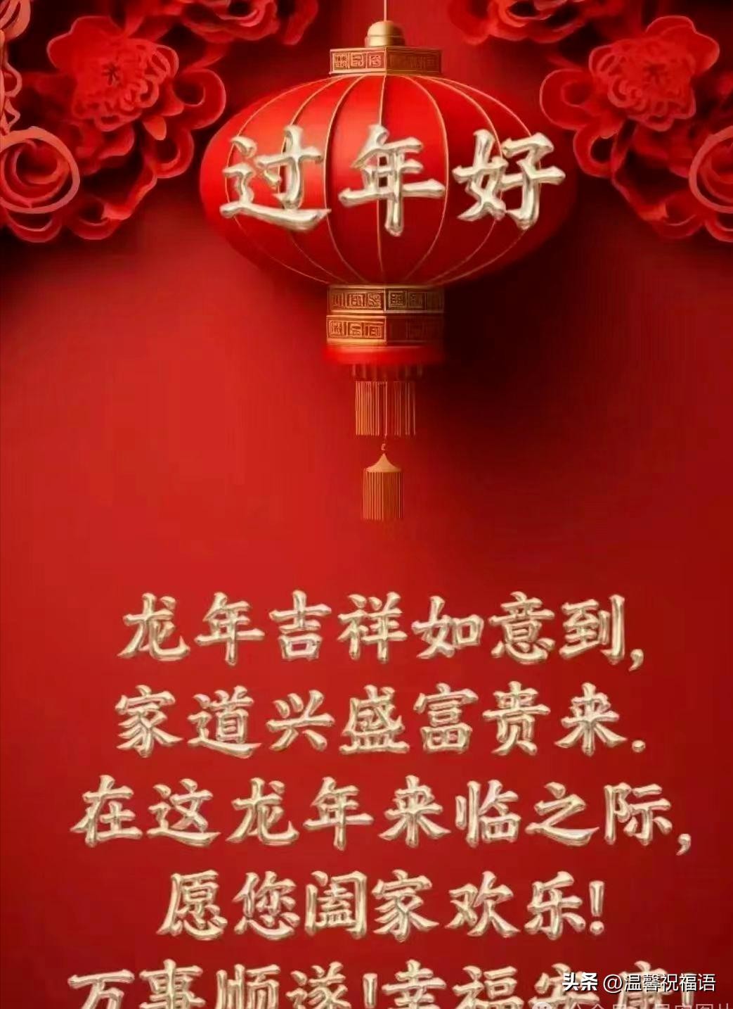 龙年到来大年初,欢度新春笑颜舒。家庭团圆乐逍遥,幸福快乐相伴多。财源滚滚旺如火,事业成功展宏图。祝愿新年好运旺,吉祥如意乐洋洋。