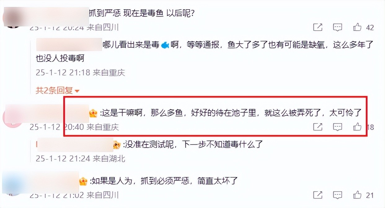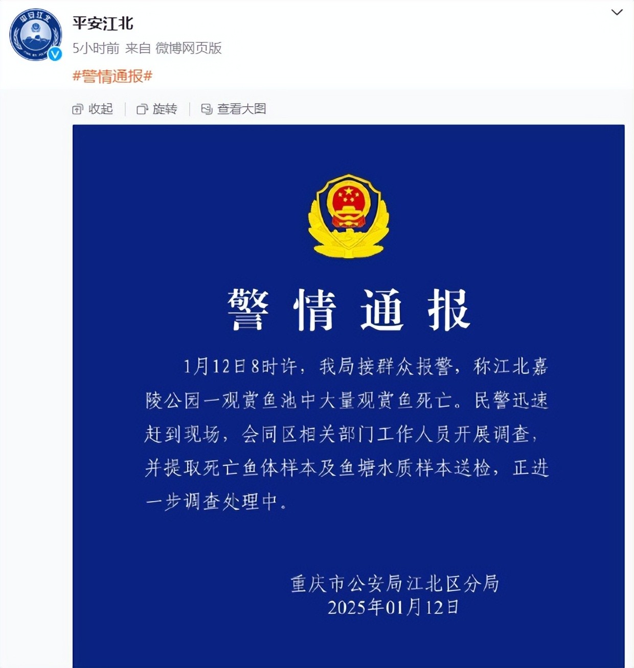 因为越来越多的人开始关注到这个事情,而且更倾向于认为是人为投毒所致。为了解开群众的疑虑,也为了公共安全,@平安江北 官方进行了警情通报:民警会同相关部门展开调查,并提取死亡鱼体样本及鱼塘水质样本送检,正进一步调查处理中。