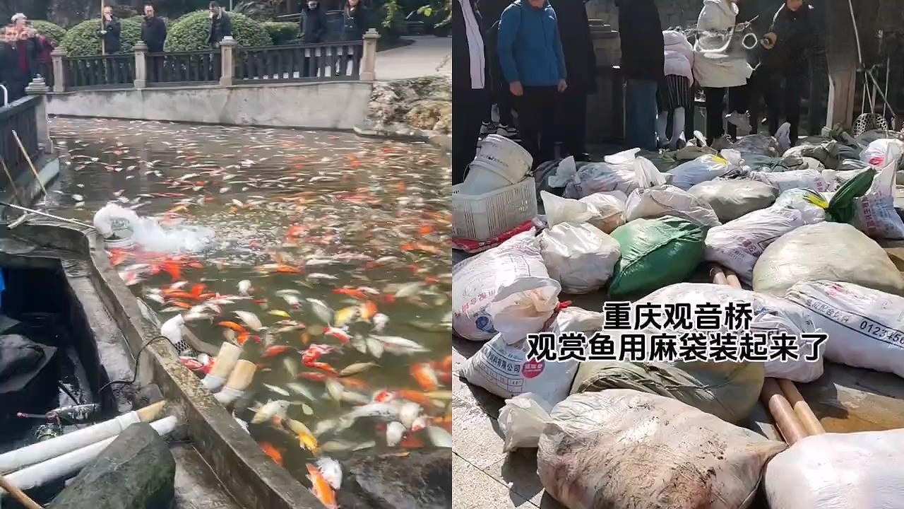 1月12日,有男子发视频称,重庆观音桥步行街观赏鱼一夜之间死了好多,铺满了整个水池,然后装了30多袋。