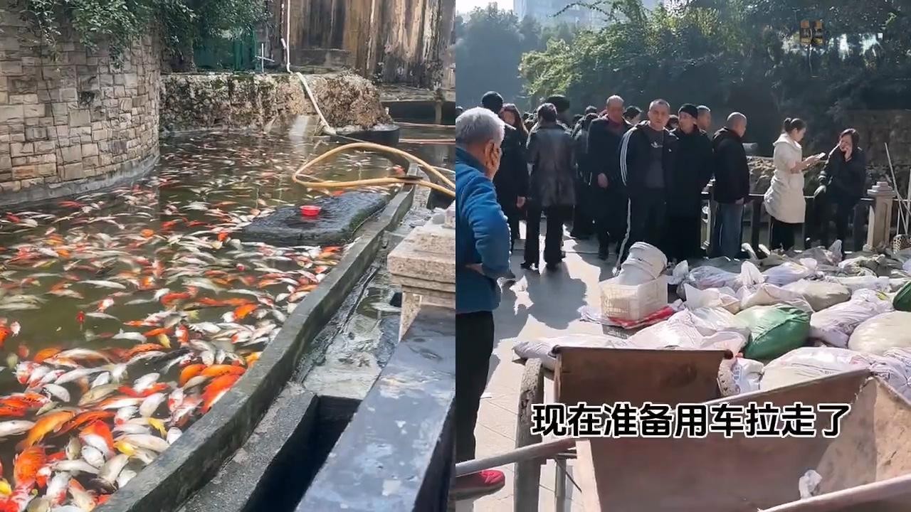 视频被网传曝光后,有附近的网友表示:今天专门带娃儿去喂鱼,到了地方就看到打捞上来一袋袋的,陪伴18年的鱼池,几乎每个月都去一次,太可惜了。
