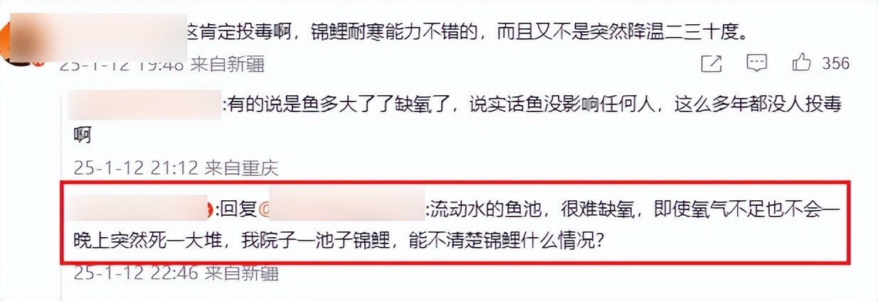 不过,对于缺氧的说法,有网友指出,这鱼池都是流动的,怎么可能缺氧?就算氧气不足也不会一晚上突然死一大堆。因为他院子里就养了一池子锦鲤,对于缺氧的说法根本不相信。