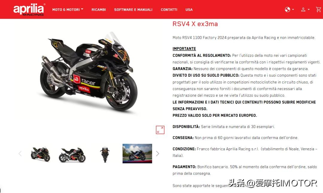 30 台限量版的APRILIA RSV4 X ex3ma ,售价为80000 欧元(约人民币63万),每台车都附有Yashi 笔记本电脑、车辆防尘罩、专用地毯和后驻车架。而买家还有机会到位于意大利诺阿莱赛事部门参观。目前在FACTORYWORKS.APRILIA.COM独家接受预定。